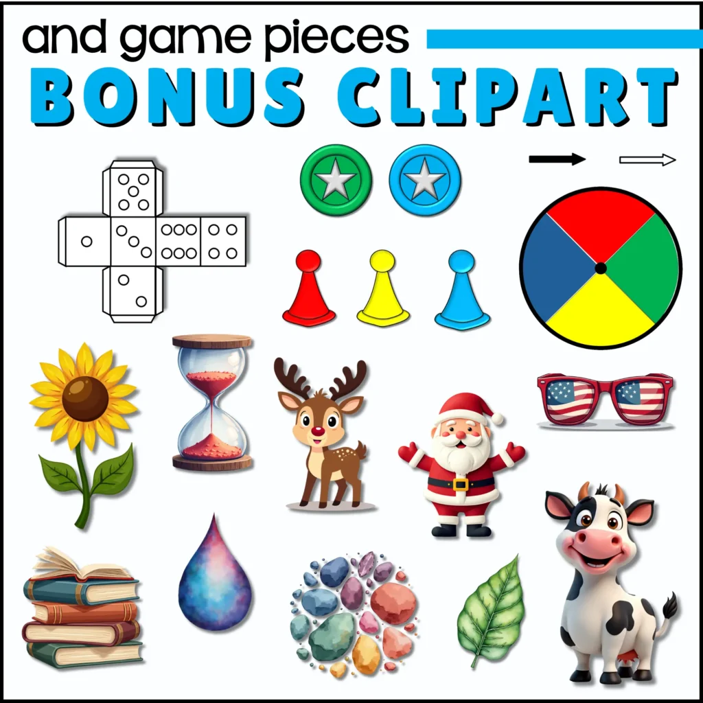 With this bundle, you’ll be able to create unlimited themed board games—Christmas, mindfulness, animals, learning games, holiday games, birthday party games, scavenger hunts, classroom activities, business coaching games and more.
